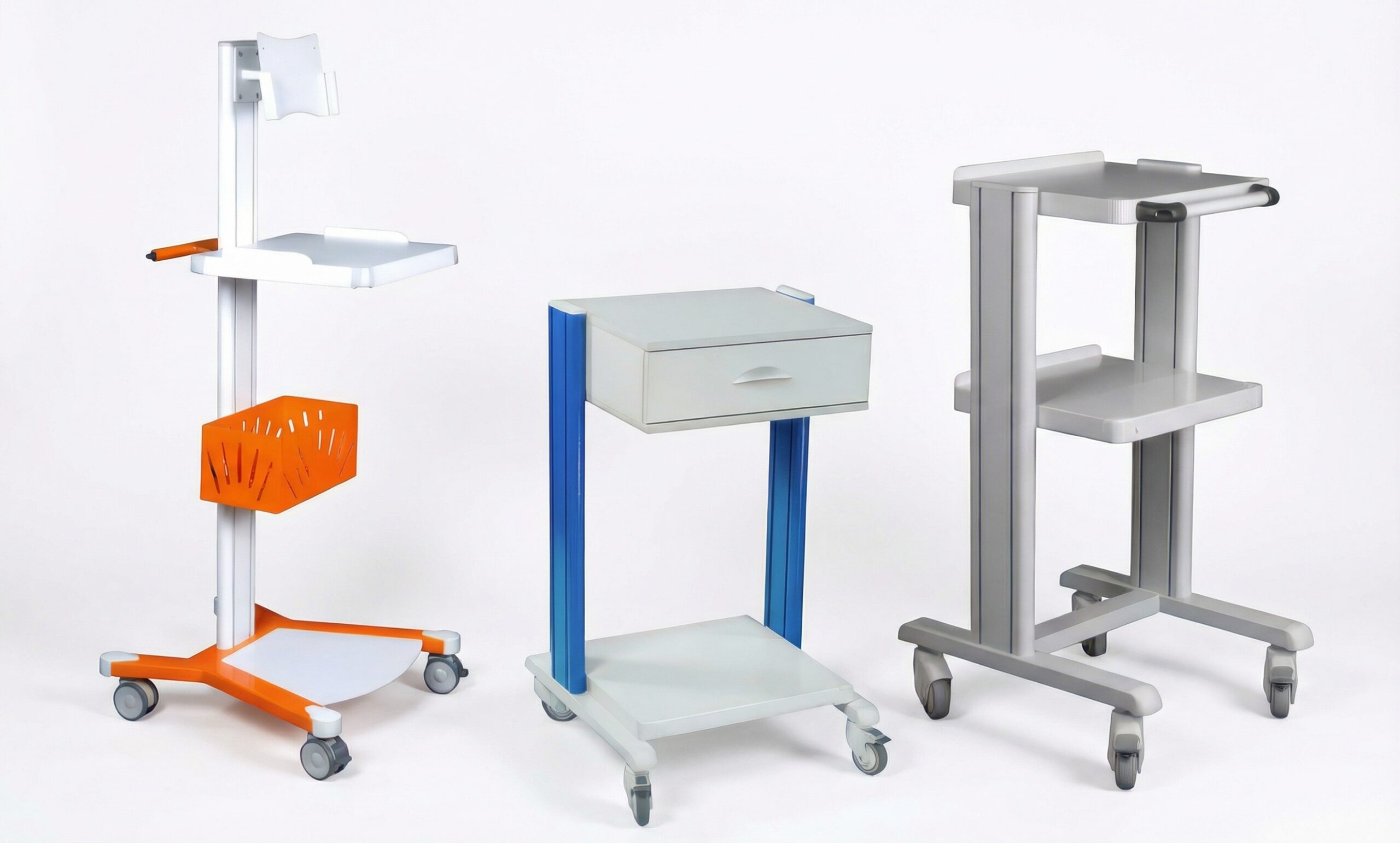 Naše vozíky a stolíky pre zdravotnícke prístroje predstavujú univerzálne a ergonomické riešenie pre ukladanie, transport a nasadenie rôznych elektromedicalských zariadení. Sortiment je navrhnutý tak, aby spĺňal požiadavky moderných zdravotníckych pracovísk – od ambulancií a diagnostických jednotiek až po nemocničné oddelenia.